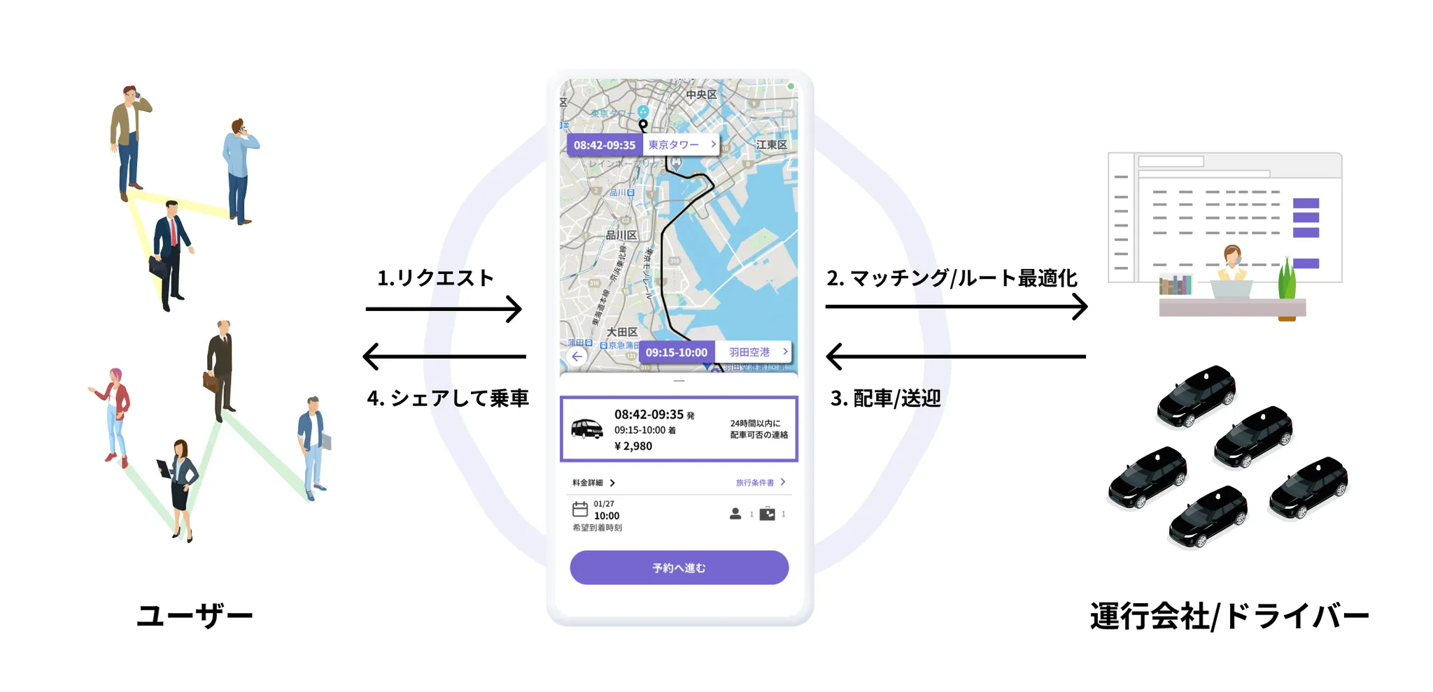 Uberなどの配車サービスと共通点も多いですが、差分は ”相乗り” をより深くサービス設計に組み込んでいる点です。例えば